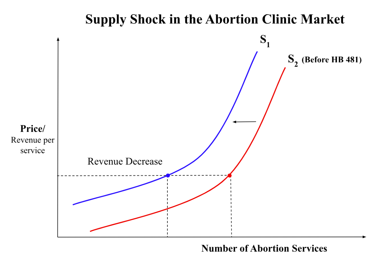 The enactment of Georgia’s House Bill 481 (HB 481) (Georgia General Assembly, 2019) in 2019, also known as the Heartbeat Bill 481, has served as a significant policy shock for abortion healthcare clinics. HB 481 was not able to effectively go into law until the Supreme Court of the United States overturned Roe V. Wade which eliminated a federal standard to protect abortion rights on a state level (Abortion Is Legal in Georgia, n.d.). This new legislation effectively bans the provision of abortions past six weeks of pregnancy, when a heart beat can typically be detected in fetuses. Because of HB 481, certain abortion clinics such as the Feminist Women’s Health Center in Dekalb County are forced to “turn away an average of five to seven patients every day” (Mador, 2023). Studies show that nearly 90% of prior abortions performed before HB 481 would no longer qualify under the law since they occurred after six weeks of pregnancy (Redd et al., 2023). This restriction of legally authorized services acts as a negative supply shock for the abortion clinic market which contracts the market for abortion care. This contraction reduces total revenue for clinics across Georgia and forces them to rely on donations (since they can no longer rely on revenue directly from services).